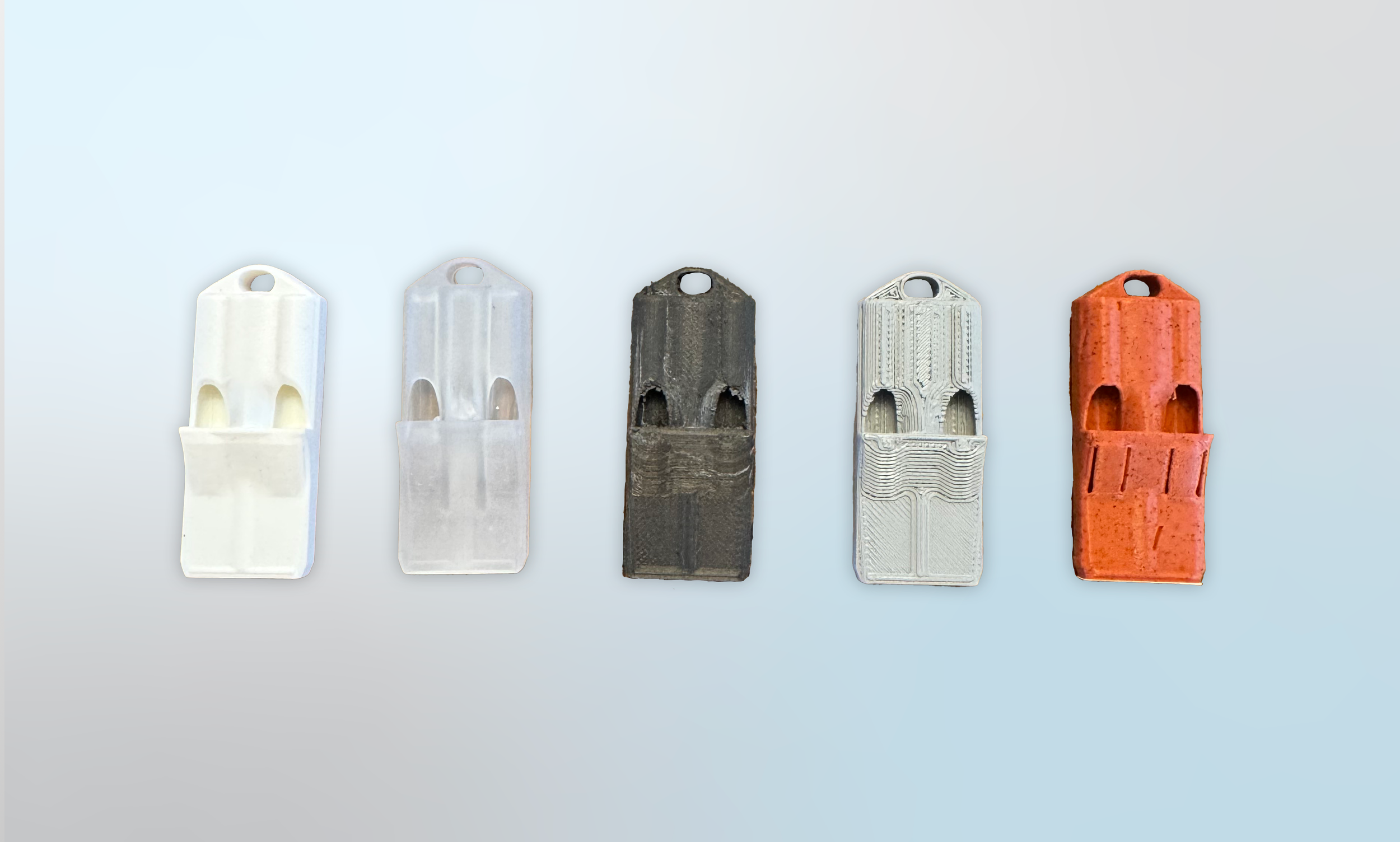 These are whistles that were printed on five different types of 3D printers. The goal of this project was to learn and compare the pros and cons of each machine. Below are details on each.