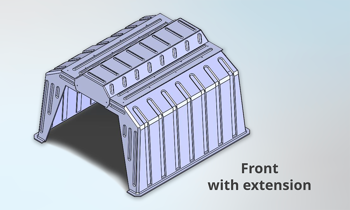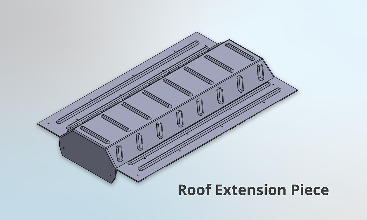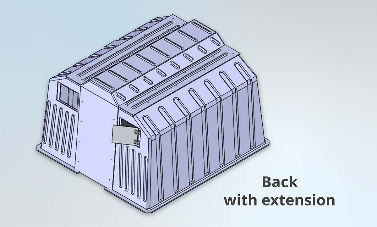 This concept was created for outdoor use as a modular resizable hutch that may grow alongside the calf, and can also house two calves with an extension in place. This concept is designed to come in once piece, but has a groove down the center that makes it easy for the end user to use a dremel or circular saw to cut along the groove to allow for the hutch to be extended into a two calf hutch. There are two extensions pieces—one for the roof and one for the back of the hutch. The front opening becomes wider. The extension pieces are secured with bolts and rubber washers to prevent any leaks.